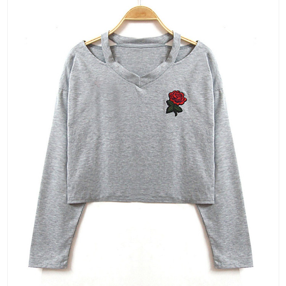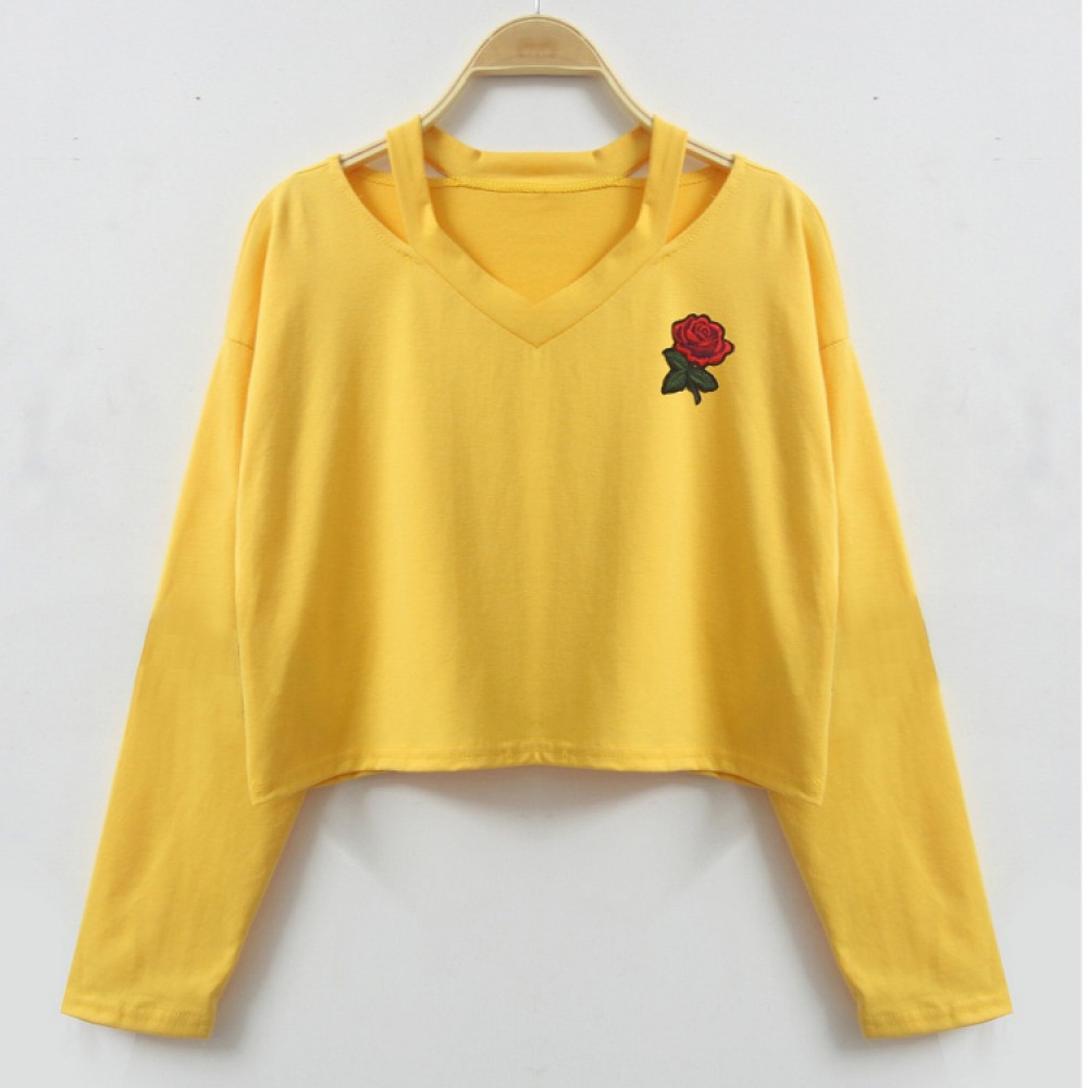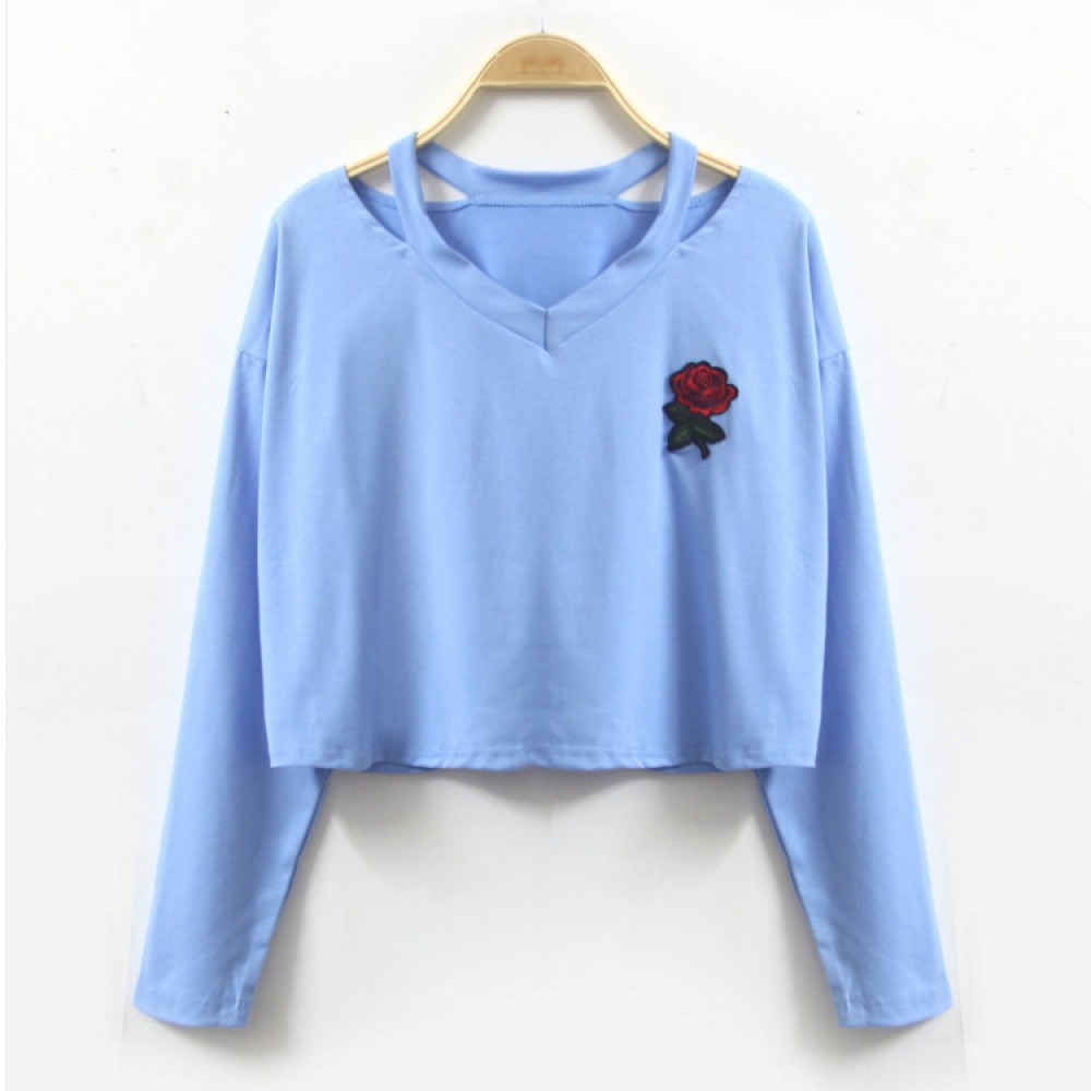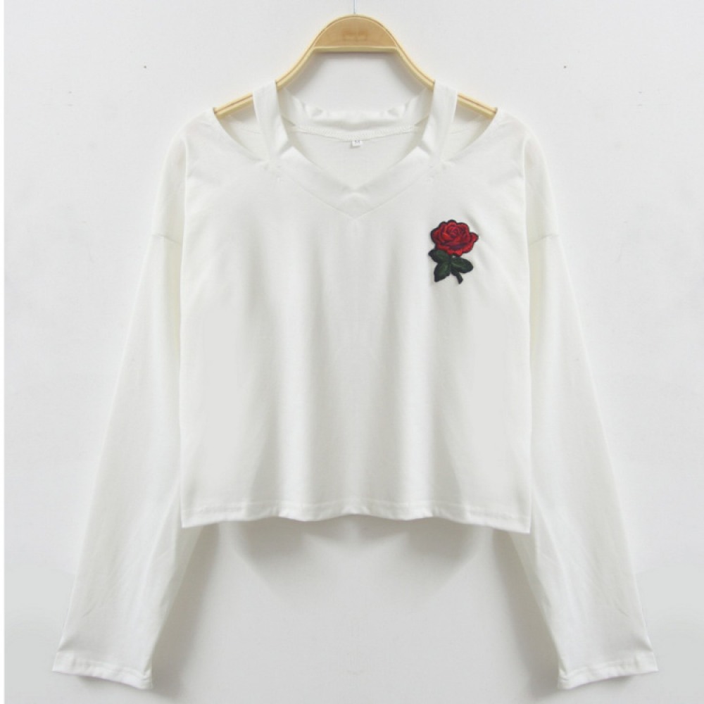 V-Neck Rose Embroidery Short Long-Sleeved T-Shirt
